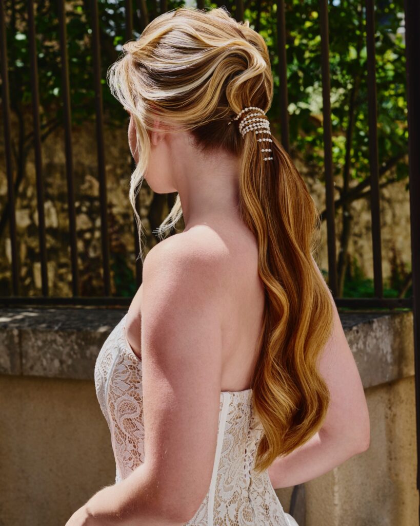 Une queue-de-cheval basse travaillée avec de jolies aigrettes (ondulations marquées) qui donnent du volume et du mouvement. Simple et chic, elle reste une valeur sûre.
