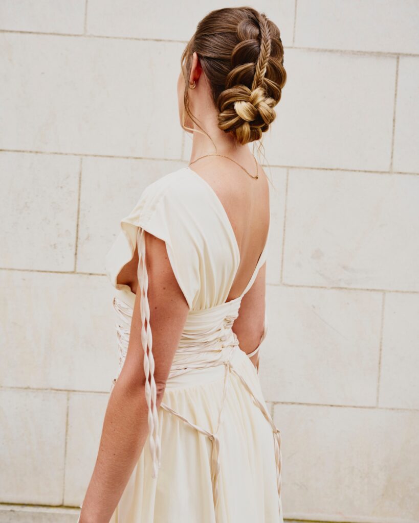 Un chignon bas de nuque torsadé et sublimé d’une tresse épi avec des mèches délicatement relâchées dans la nuque. Élégant et doux, avec une touche naturelle et bohème.