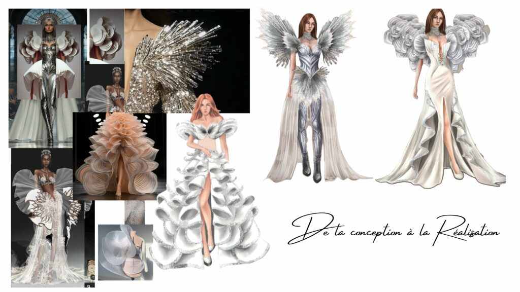 De la conception à la réalisation, chaque tenue est une véritable oeuvre d’art unique. Les premiers prototypes dessinés prennent vie sous les mains expertes de la Cage d’Or, transformant des esquisses en créations élégantes où l’innovation et la beauté se rencontrent dans une harmonie parfaite.